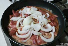 팬에 이제 고기를 넣고 물을 반컵 정도 넣어 구워주었어요. 불고기의 경우 한장 씩 뒤집어 굽기가 어렵기 때문에 물을 넣고 졸이듯이 볶아주어야 된다고 하더 라구요