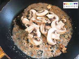 다진 마늘이 어느 정도 볶아졌으면 버터를 넣고 버터가 다 녹았으면 양송이버섯을 넣고 볶아주세요.