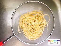 끓는 물에서 2분 정도 익힌 파스타 면을 채반 에 옮겨주세요. 이때 주의 하실 것은 찬물에 헹구시지 마시고 그냥 이대로 파스타 면을 식혀주세요.