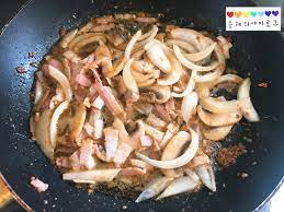채 썬 양파와 베이컨이 잘 익을 때까지 볶아 줍니다