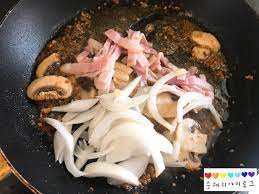 양송이 버섯이 어느 정도 노릇하게 익었으면 채 썬 양파와 베이컨을 넣어주세요