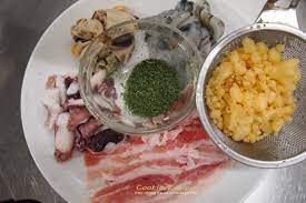 | 11 | 해물 위에 얇게 저민 돼지고기나 베이컨을 덮듯이 올려주세요. | ![]() |