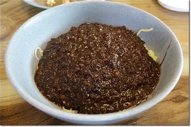 옛날짜장의 전설, 짜장면 매니아의 성지라고 불리는 동승관은 충청북도 영동의 덕승관 인적 드문 시골 마을에서 60년간 우두커니 지켜온 곳입니다. 내부는 오랜 전통이 느껴지며 다른 집에 비해 얇은 면발이 특징입니다. 양념이 잘 스며들게 하기 위해 이렇게 뽑아내어 식감도 쫄깃하고, 간 돼지고기와 잘게 썬 야채가 들어가기 때문에 단 맛이 약하고 구수한 맛이 강하다고 합니다. |